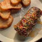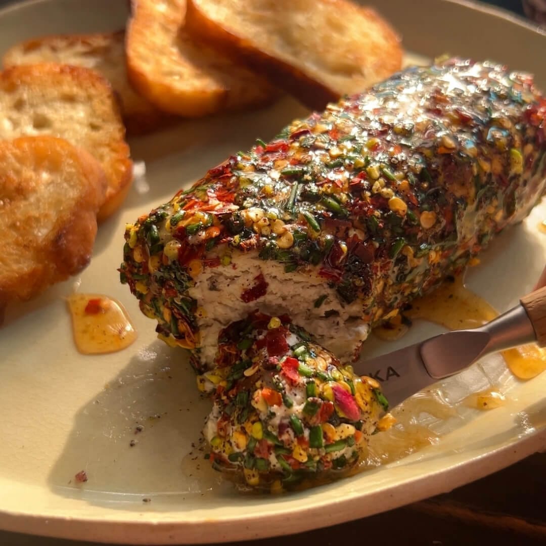 Creamy, tangy, and packed with flavor, it’s infused with black Italian truffle pâté and rolled in chili flakes, sumac, chives, and pistachios. Pair it with crackers or toasted baguette slices for a simple yet impressive appetizer.