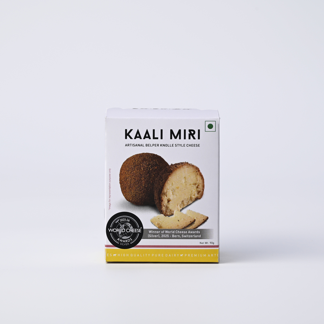 Kaali Miri is an aged cheese ball infused with crushed garlic, Himalayan pink salt and is enrobed in freshly ground, aromatic kerala black pepper. Winner of World Cheese Awards – (Silver) 2025 – Bern, Switzerland.