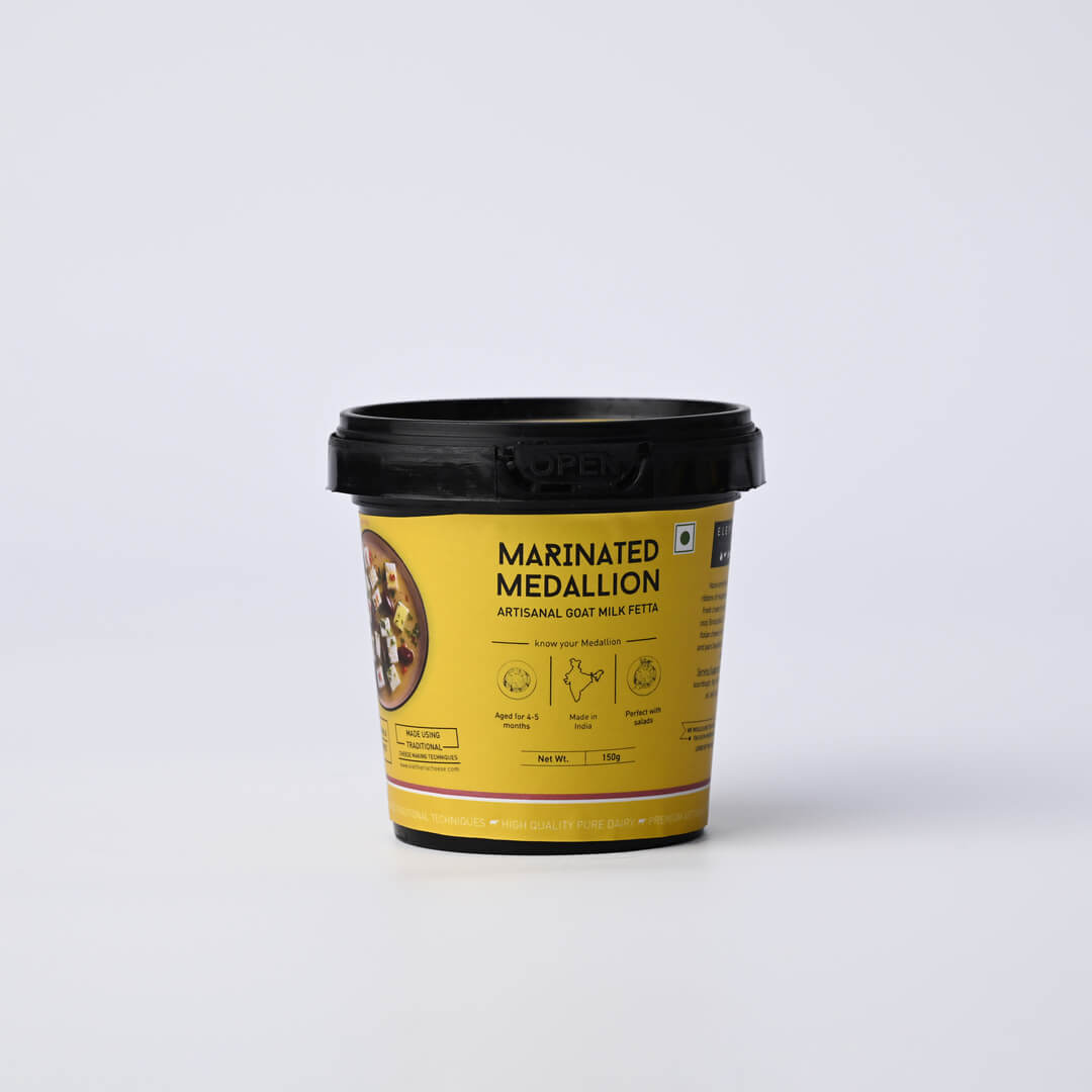 Our ‘Medallion’ goat milk Feta style cheese is made with farm fresh, indigenous goat milk. It’s hooped in cheese baskets, which lend the cheese it’s charecteristic mesh rind & beautiful open & creamy texture. We skilfully age our Medallion for a period of 5 months, which gives the cheese it’s complex herby flavour profile with a distinct lemony goat milk tang.
