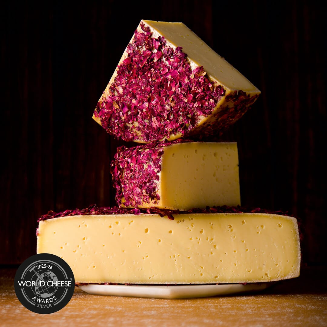 Yeoor is our mountain-style cheese inspired by the Swiss Gruyère tradition. Aged for 8–9 months, it develops a smooth, supple texture with complex nutty, sweet and herbaceous flavours. It’s rind, adorned with rose petals and fennel, is a visual homage to both our indigenous rose preserve, Gulkand, and Alpine blossom cheeses. Yeoor melts effortlessly into fondue or grilled cheese. Named after the Yeoor Hills that border Sanjay Gandhi National Park, close to our creamery, it stands as our ode to place, craft, and time well spent. Winner of World Cheese Awards – (Silver) 2025 – Bern, Switzerland.
